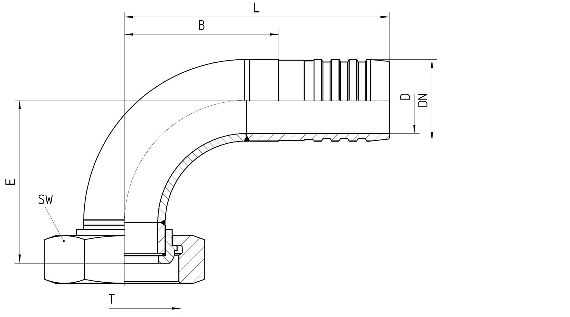 | Bestell-Nr. | DN in mm | T | SW in mm | D in mm | E±3 in mm | B±3 in mm | L±3 in mm | Bestell-Nr.Kurz | B±3 in mm | L±3 in mm |