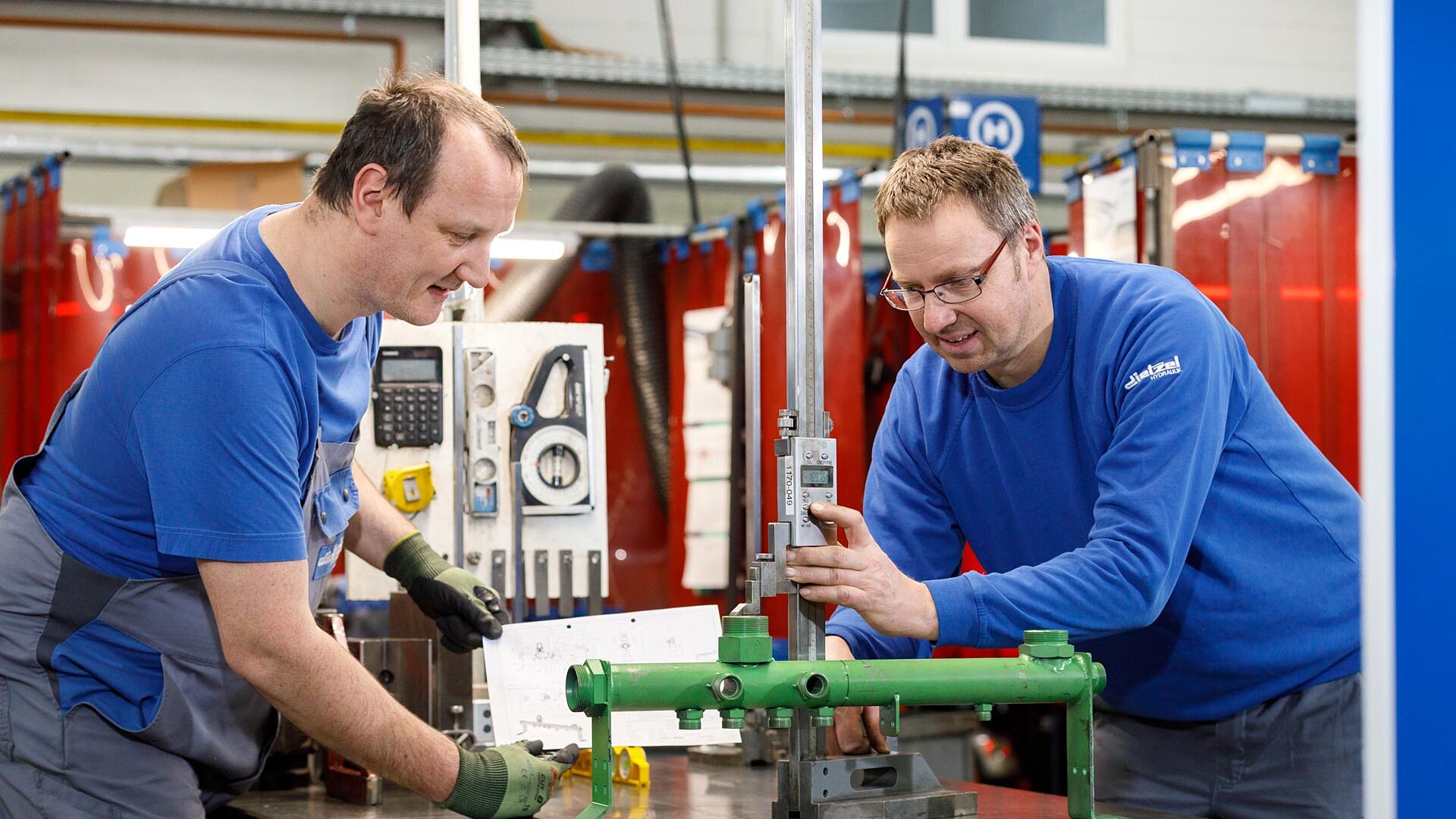 Grundsätzlich ist jeder Tag gleich, aber doch immer verschieden. Meist beginnt er mit der Qualitätskontrolle von Bauteilen der Kollegen. Da Qualität uns besonders wichtig ist, überprüfen wir vorgerichtete teile nach dem 4- Augenprinzip. Nach der Qualitätsprüfung, dem nachmessen der Bauteile, widme ich den Aufträgen. Das können Baugruppen zum Vorrichten, Zerspanen oder Umformen sein. Das Vorrichten von Teilen ist das verbinden von zum Beispiel Gewindeanschlüssen an Rohre durch das Schweißverfahren WIG. Dieser Arbeitsgang ermöglicht es, dass die Teile in der richtigen Lage und Position bleiben und wir somit den Schweißern die Arbeit vorbereiten.